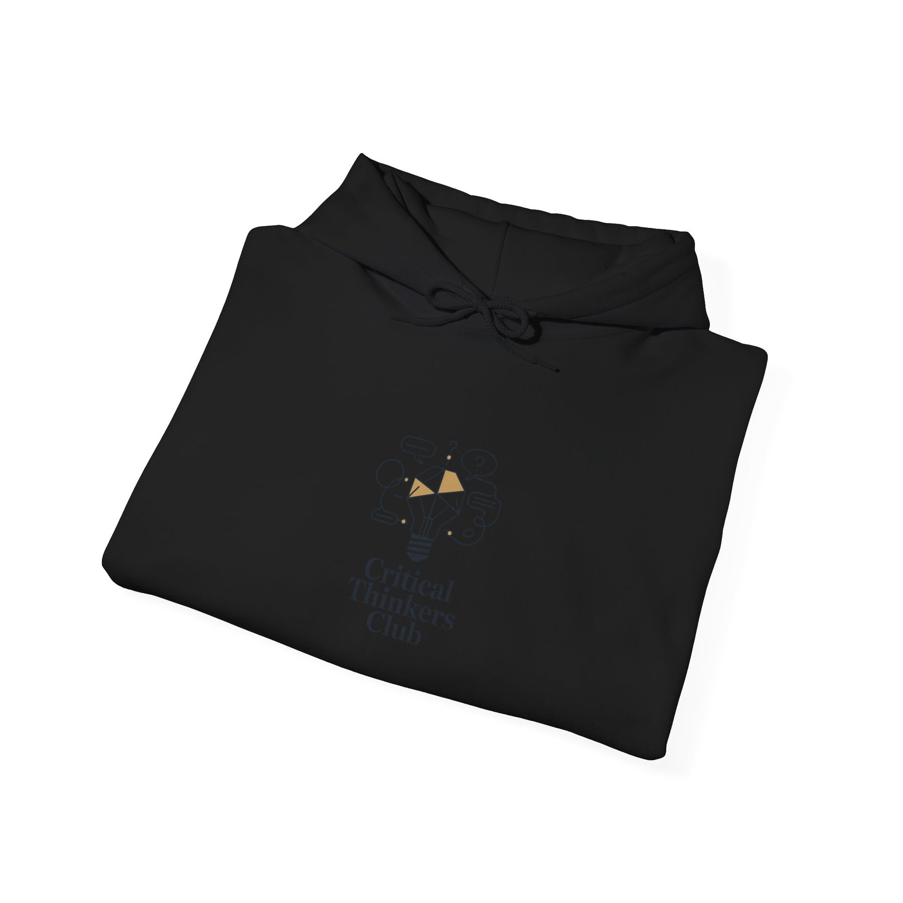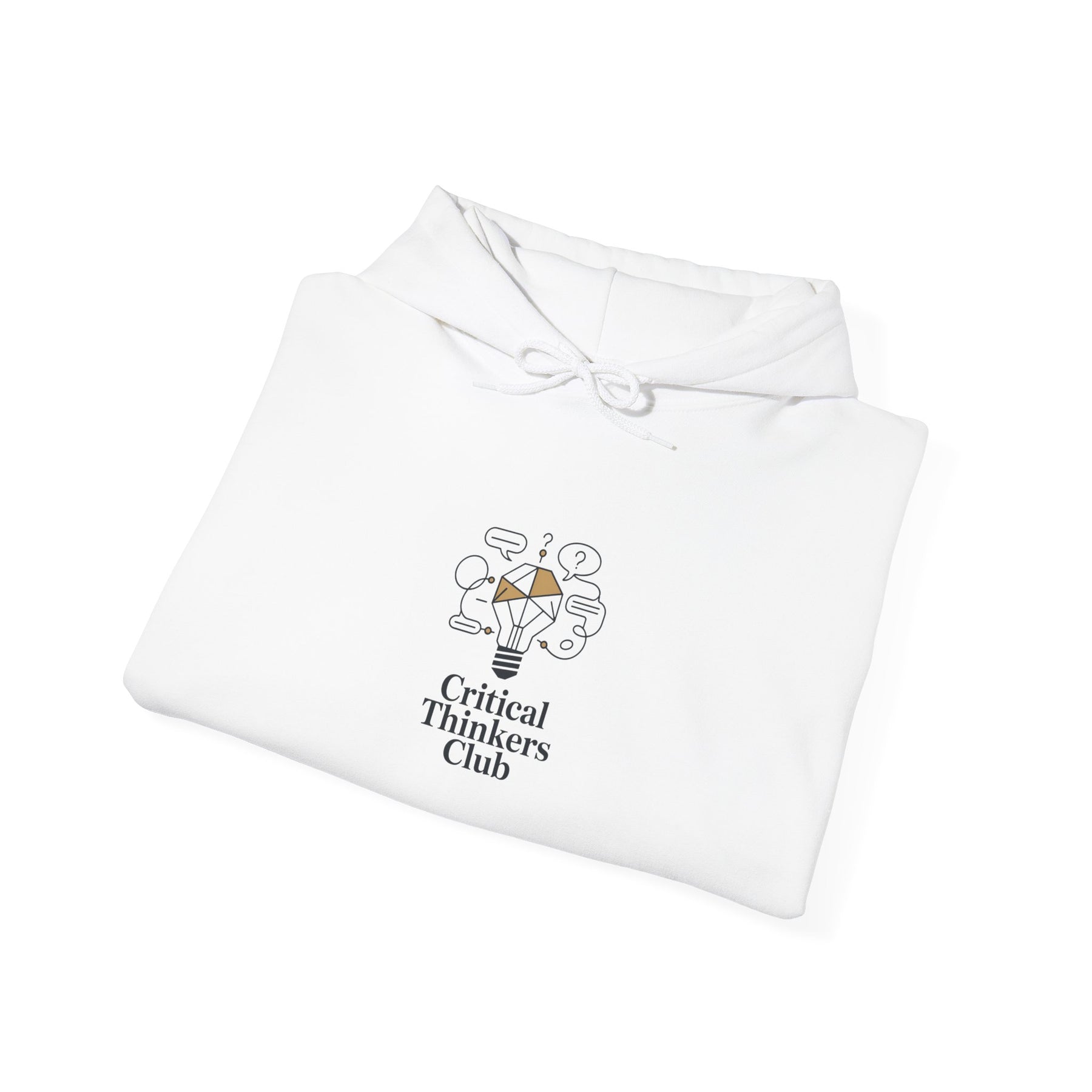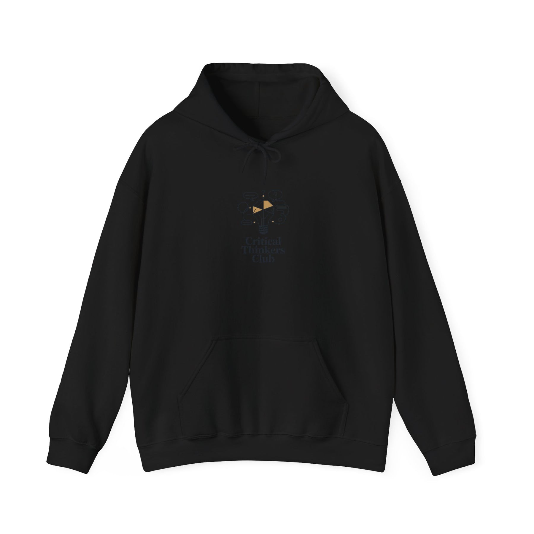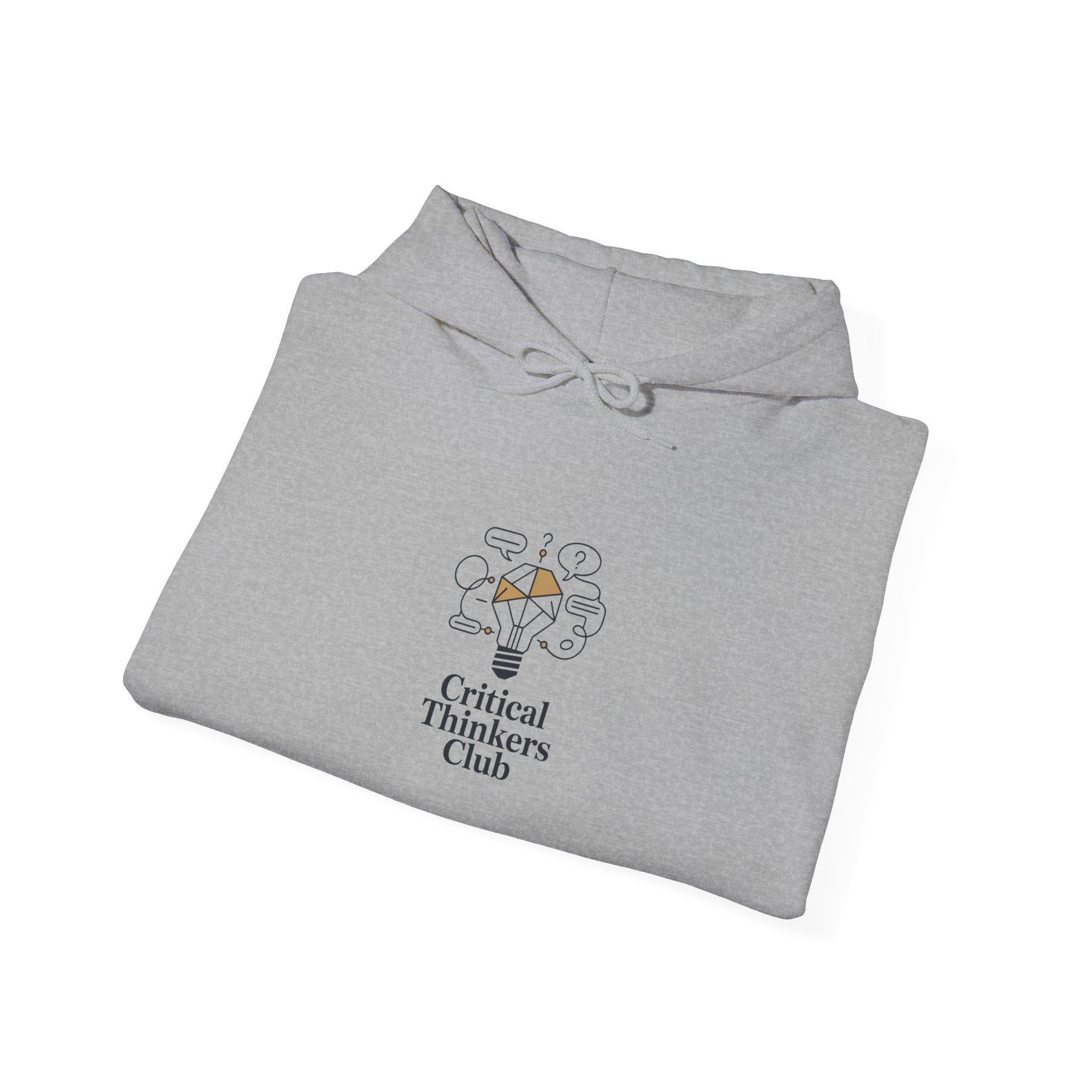 A clean, understated hoodie that signals thoughtful wit for students and educators. The small, centered design pairs a simple brain/lightbulb processing motif with the label “Critical Thinkers Club,” using a minimal monochrome palette and geometric lettering to convey quiet intellect rather than loud humor. It reads as a subtle club badge—calm, clever, and easy to layer for campus or study sessions. Product features - Kangaroo pouch pocket - Adjustable drawstring hood with color-matched cord - 50% cotton, 50% polyester medium-heavy fabric - Classic fit with tear-away label - Made in Bangladesh Care instructions - Tumble dry: medium - Iron, steam or dry: low heat - Do not dryclean - Machine wash: cold (max 30C or 90F) - Non-chlorine: bleach as needed