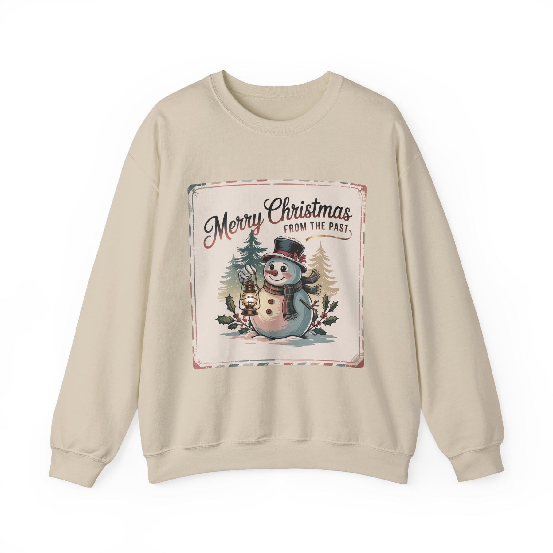 A warm, vintage-postcard style crewneck featuring a faded snowy scene with a smiling snowman, lantern, and evergreen silhouettes framed by distressed borders and period script. Muted sepia and pastel tones with grainy texture evoke 1920s–50s holiday cards, giving the sweatshirt a sentimental, collectible feel that reads like an old-fashioned seasonal greeting printed on fabric. Product features - 50/50 cotton-polyester blend, 8.0 oz/yd² (271 g/m²) - Classic fit crewneck with double-needle stitching for durability - Embroidery available on left chest, center chest, large center chest, or wrists - Tubular knit (no side seams) with ribbed knit collar and tear-away label - Made in Nicaragua; meets safety standards and uses OEKO-TEX certified dyes Care instructions - Machine wash: cold (max 30C or 90F) - Non-chlorine: bleach as needed - Tumble dry: low heat - Do not iron - Do not dryclean