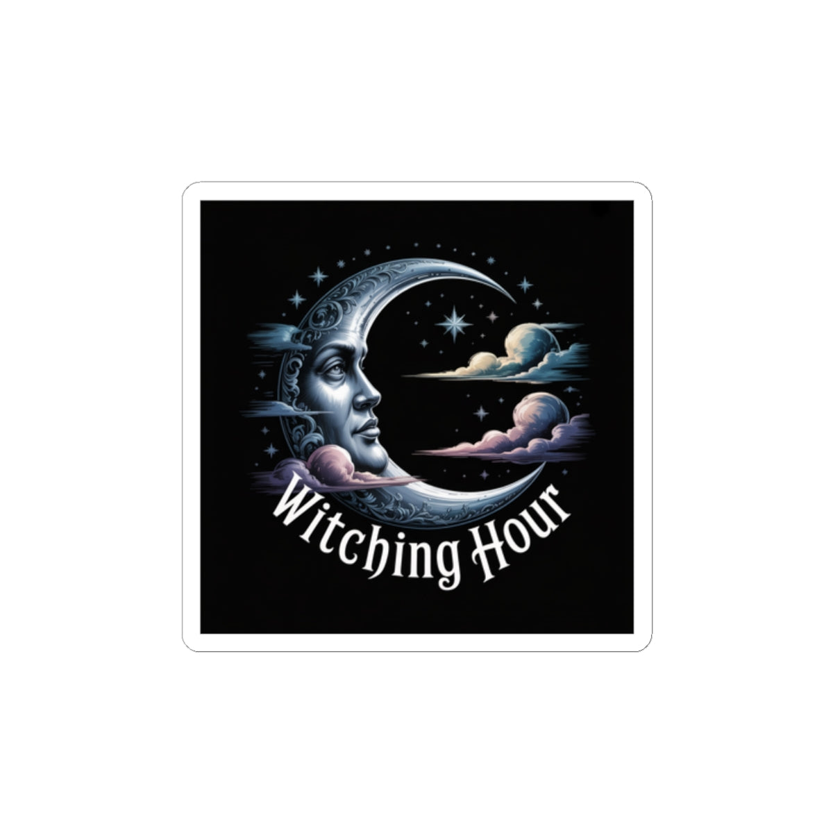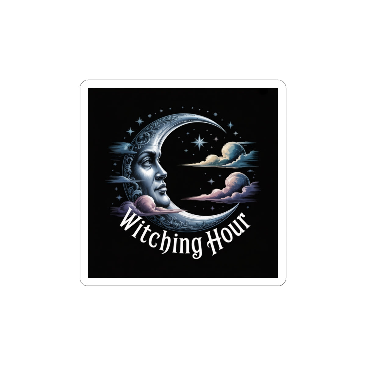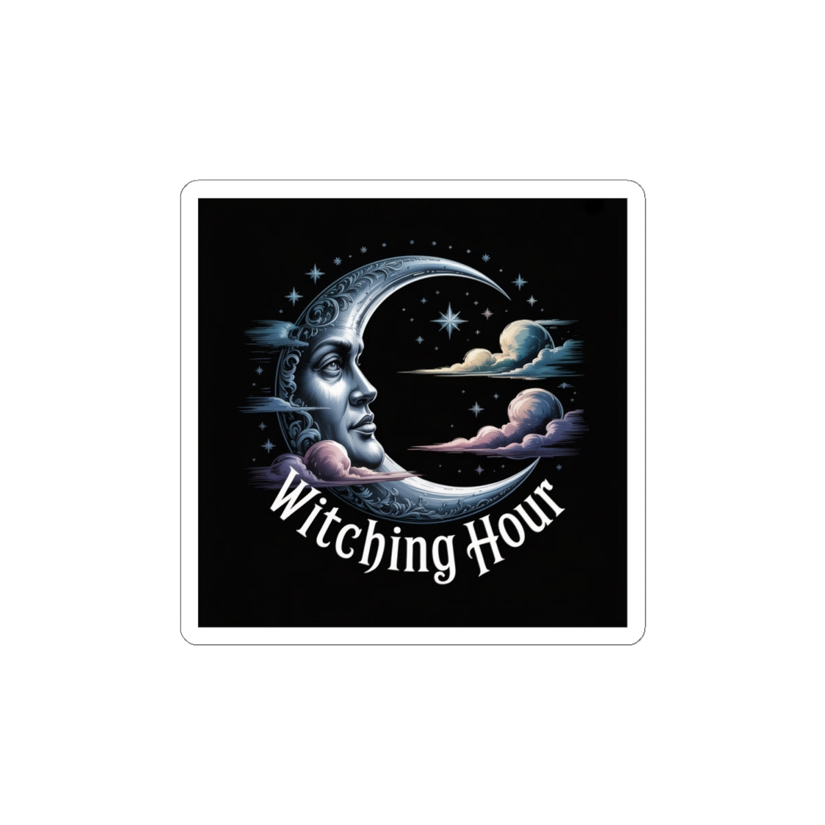 Moody crescent-moon artwork in cool midnight tones, evoking solstice ritual and quiet ceremony for a witchy-holiday audience. The illustrated moon face, scattered stars, and soft cloud accents read as darkly ethereal and celestial — a restrained, gothic-holiday motif that blends into bookish, dark-academia aesthetics. Minimal text sits low and ornamental, acting like a small incantation rather than a slogan, so the sticker keeps an atmospheric, ritual-ready presence on laptops, journals, or windows. Product features - Glossy paper finish: Scratch-resistant surface - Vinyl surface with permanent acrylic adhesive backside - Printed with eco-solvent inks for vibrant colors - PNG format required for kiss-cut stickers - Available in white or transparent options Care instructions - Use a soft, clean and dry cloth to gently brush any dust or dirt off from the center of the sticker outwards.