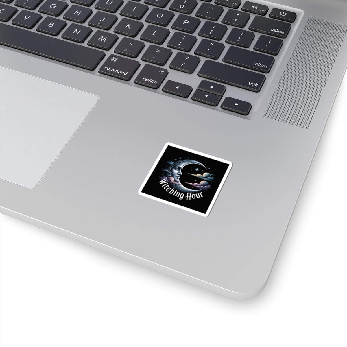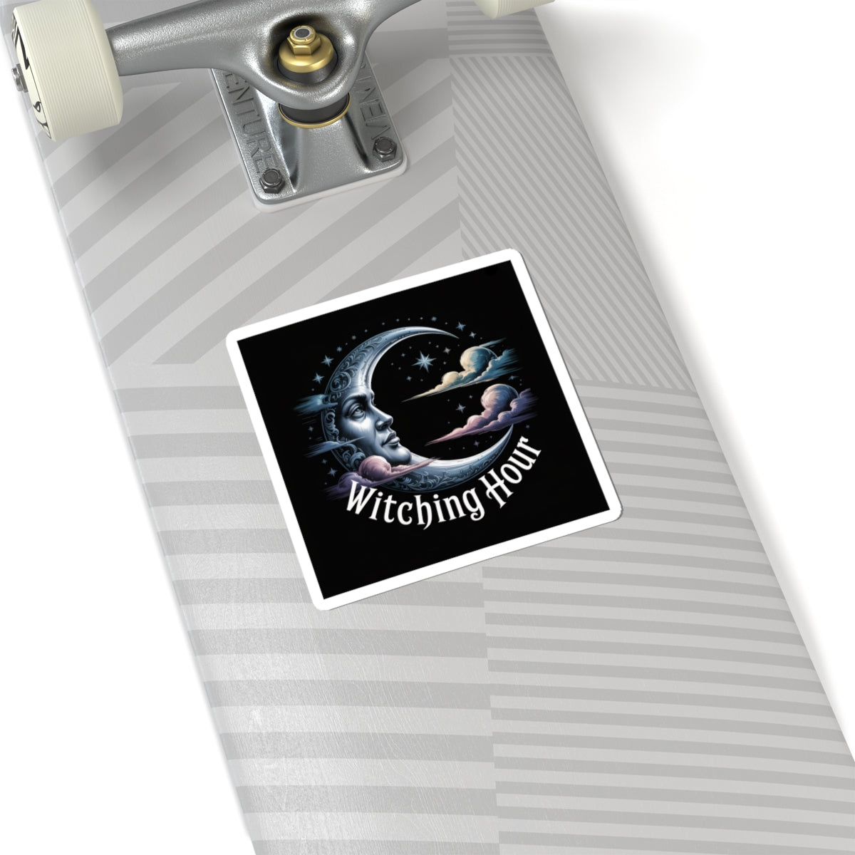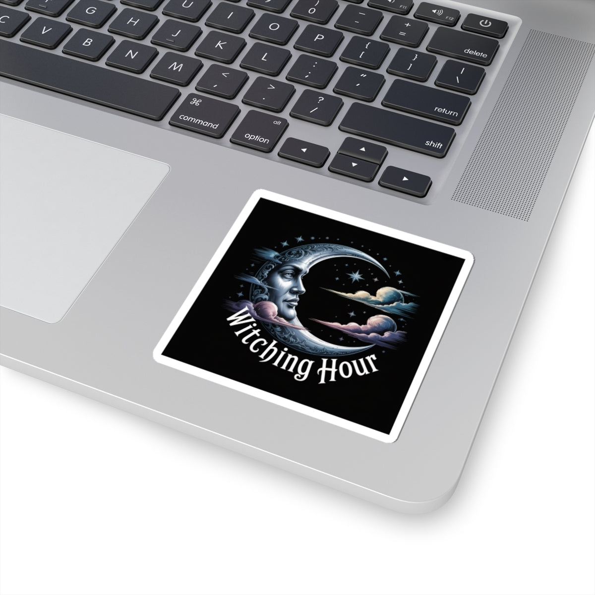 Moody crescent-moon artwork in cool midnight tones, evoking solstice ritual and quiet ceremony for a witchy-holiday audience. The illustrated moon face, scattered stars, and soft cloud accents read as darkly ethereal and celestial — a restrained, gothic-holiday motif that blends into bookish, dark-academia aesthetics. Minimal text sits low and ornamental, acting like a small incantation rather than a slogan, so the sticker keeps an atmospheric, ritual-ready presence on laptops, journals, or windows. Product features - Glossy paper finish: Scratch-resistant surface - Vinyl surface with permanent acrylic adhesive backside - Printed with eco-solvent inks for vibrant colors - PNG format required for kiss-cut stickers - Available in white or transparent options Care instructions - Use a soft, clean and dry cloth to gently brush any dust or dirt off from the center of the sticker outwards.